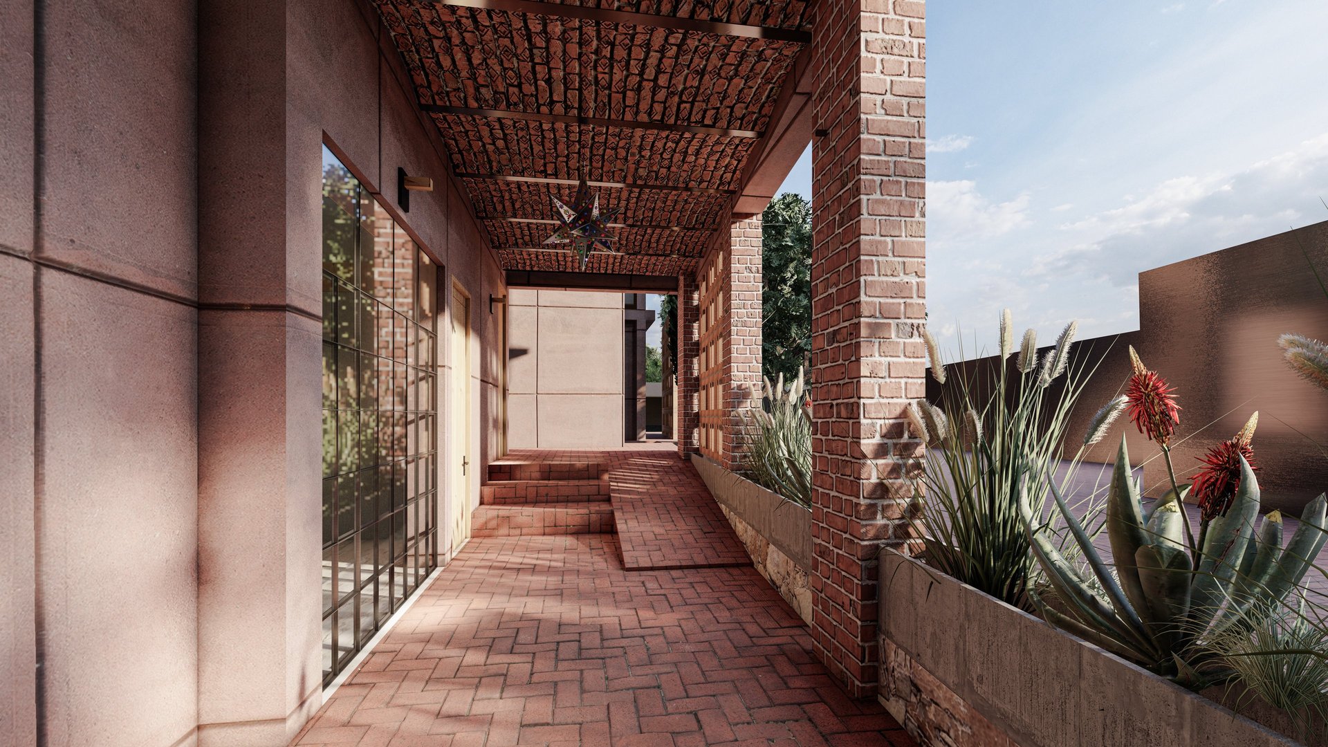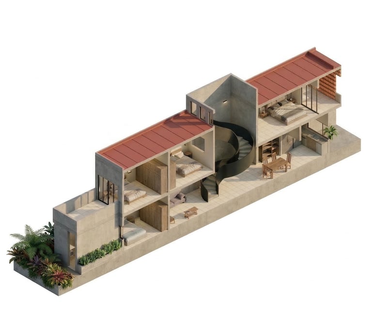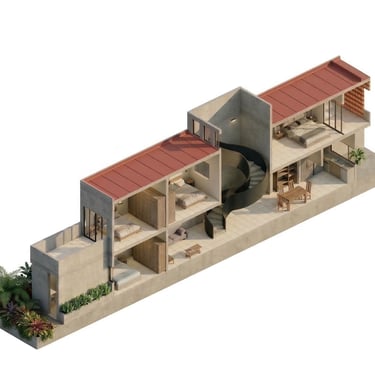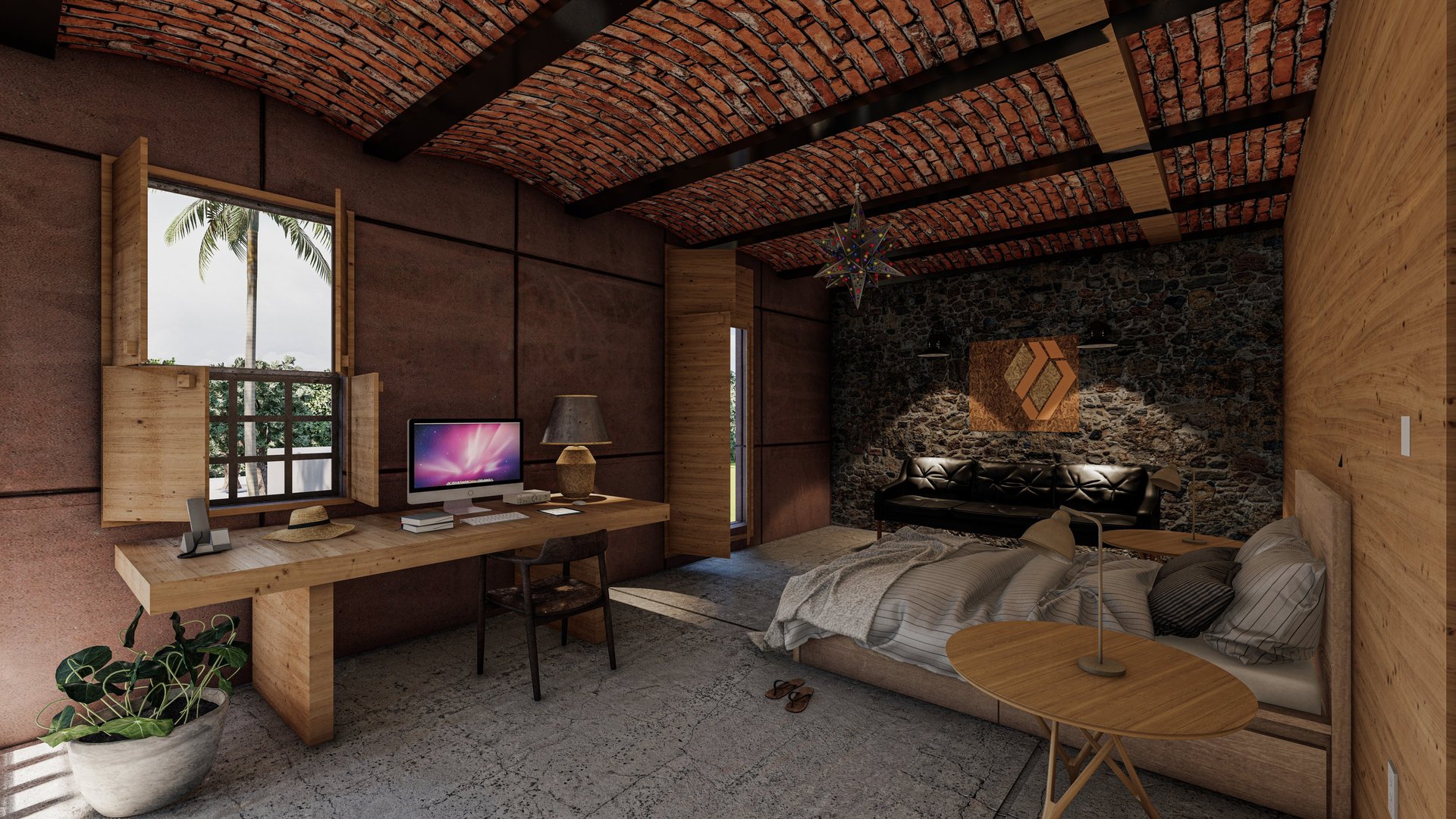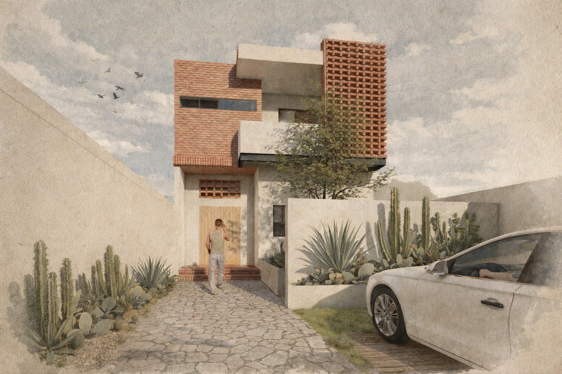 El concepto nace del membrillo, elemento identitario de Jalpa cuya tonalidad guía la paleta de materiales y texturas de la obra. Frente al templo de Luis Long, el objetivo fue generar una pieza que dialogue activamente con su herencia social; un lugar donde el entorno cultural se convierte en parte del hogar, garantizando una estancia llena de significado y respeto por el paisaje urbano.